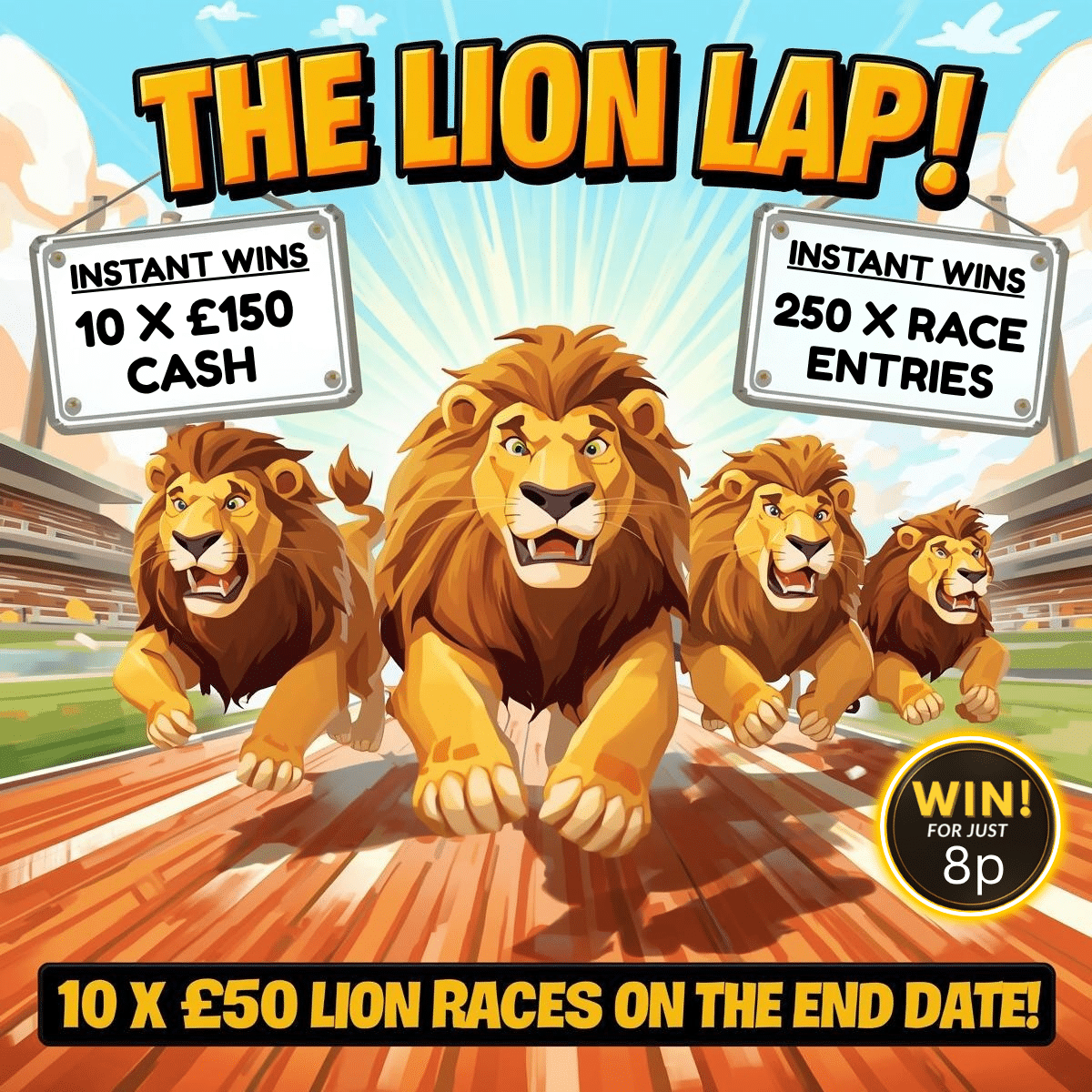 Lion Lap 🦁🏁 10 x £150 Cash Instant Wins + 10 x £50 Lion Races + £200 End Prize!