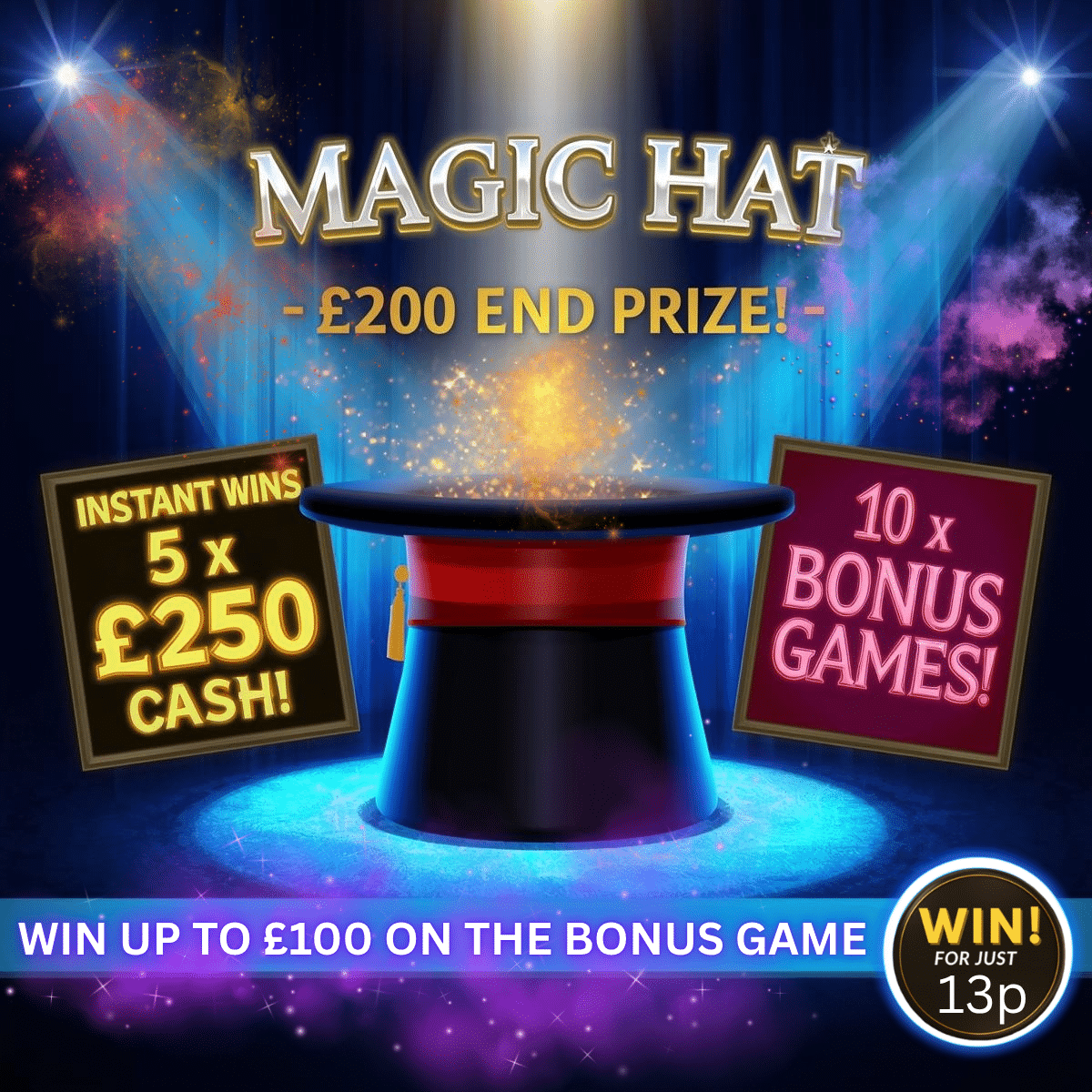 Magic Hat🎩£200 End Prize💰5 x £250 Instants💥10 Bonus Games Up To £100🪄